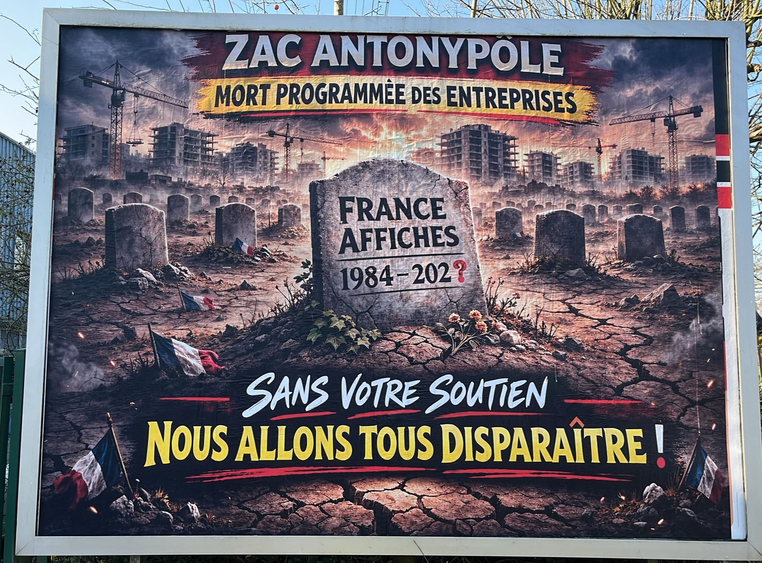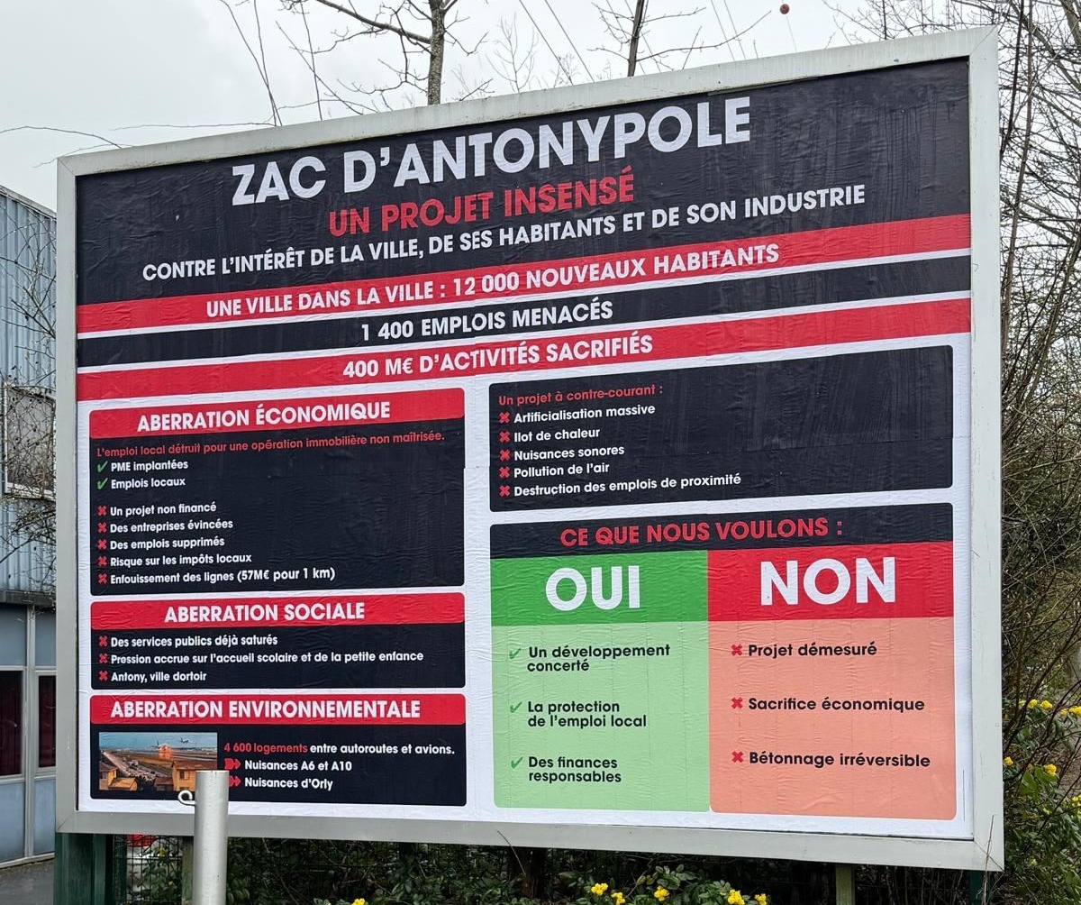 Une fois encore, l’affichage que nous reproche le maire n’est pas du fait d’Antony Terre Citoyenne, mais bien d’une entreprise concernée par ce projet, qui s’y oppose et le fait savoir par une affiche placée sur son terrain privé. Antony Terre Citoyenne s’oppose également à ce projet qui détruit le tissu d’entreprises et industries à Antony, et place des logements à 80 mètres d’une autoroute.