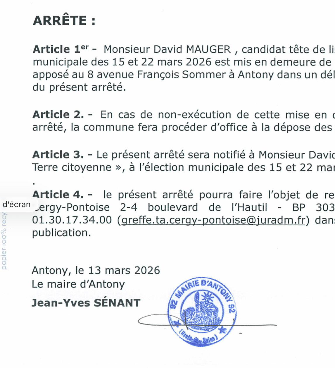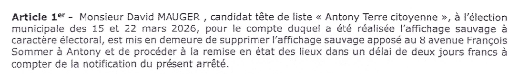 Le vendredi 13 mars au soir - à quelques heures de minuit, l’entrée en vigueur du weekend de silence électoral, le maire a pris un arrêté de mise en demeure ordonnant à notre tête de liste David Mauger de retirer sous 48 heures une affiche critiquant le projet du maire pour un quartier, Antonypole.